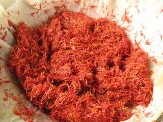 2、然后加入“粟饭浆清”或者食醋继续淘洗,把汁水滤掉,把剩下的红花铺开晾干。粟饭浆清其实就是发酸的米汤,和食醋一样都是酸性的,可以进一步把黄色素去除;