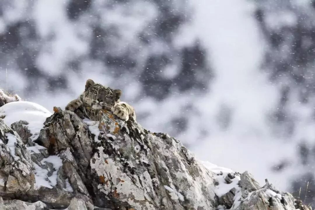 其中雪豹在青藏高原的寒冷环境中演化出了适应高寒环境的一系列特征。雪豹的毛发是所有大猫中最厚最长的,冬季肚子上的毛可以长至12厘米,既可以有效保暖,摸起来手感也肯定很好。烟灰色或奶黄色装饰着较为稀疏豹纹的毛色与岩石上的地衣特征极其相似,使其能够很好地与周围的裸岩环境融为一体。