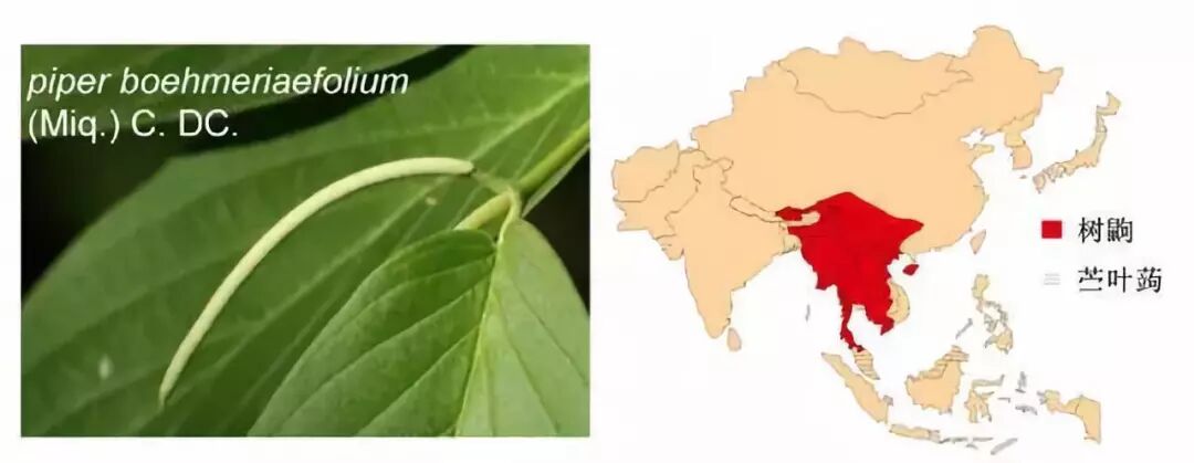 左:苎叶蒟;右:树鼩和苎叶蒟在东南亚地区的分布情况。图片:Han Y,et al. / PLoS Biol (2018)