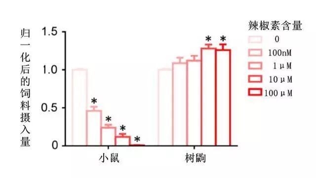 结果发现,随着辣椒素浓度的增加,小鼠的进食量显著下降——看样子是不堪辣椒素的折磨了;而我们的树鼩选手,随着饲料中辣椒素含量增加,不仅没有停止进食,反而有胃口大开的趋势,在吃辣比赛中拔得头筹。