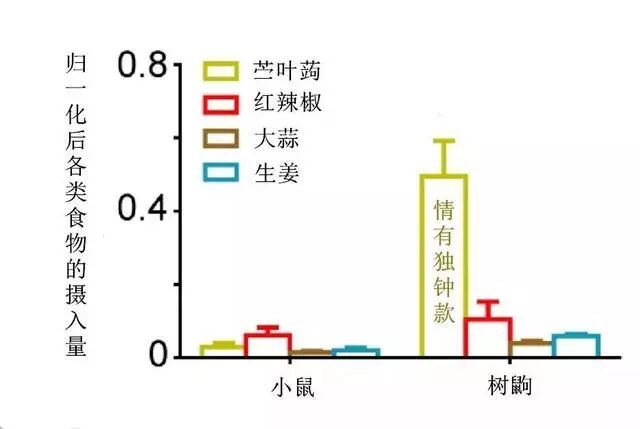 于是,研究者们准备了苎叶蒟、红辣椒、大蒜、生姜这几样“辣味小吃”,分别提供给野生小鼠和野生树鼩作为食物,并观测它们在48小时内对这几种辛辣食物的摄入量。结果发现,小鼠对这几种食物的喜好差距不明显;而树鼩,对苎叶蒟情有独钟。