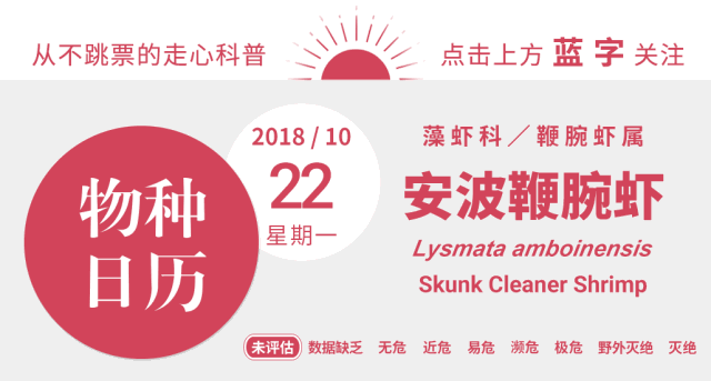 其实臭鼬清洁虾有两种,一种是本文主角安波鞭腕虾,其白色条纹在尾节前端有一个“T”字结尾,尾扇两缘各有两个白色斑点;另一种是L. grabhami,其白色花纹从额角一直纵穿到尾节末端,尾扇两缘是细长的白线,该种尚无中文名,可以理解为尾纹鞭腕虾。两者的分布也不同,前者分布在印度洋—太平洋海域,后者在大西洋生活。