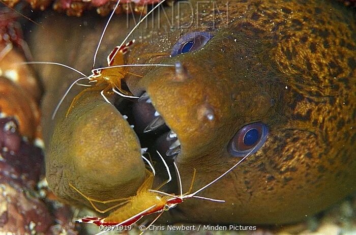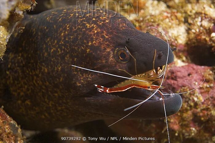 一只安波鞭腕虾正在为一条裸胸鳝“刷牙”——“对,不要动,嘴再张大些。”图片:Tony Wu / NPL mindenpictures
