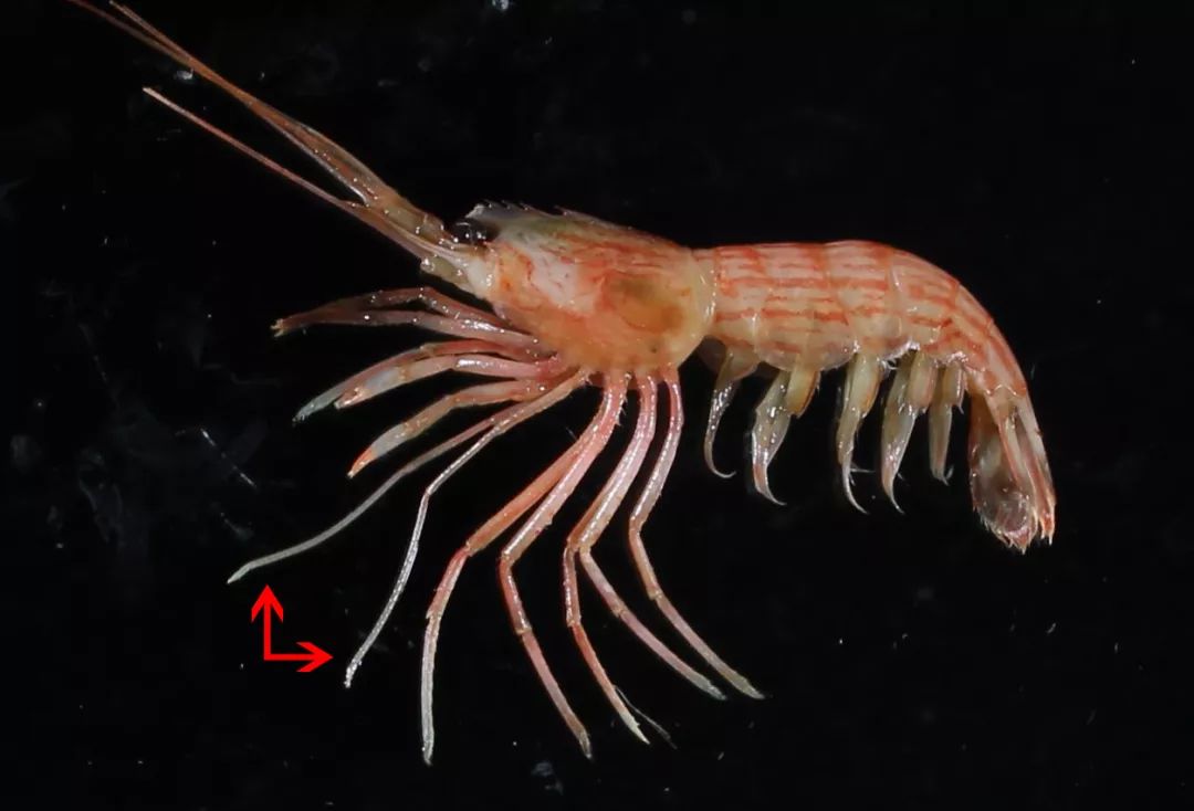 图为鞭腕虾属的鞭腕虾L. vittata,红色箭头所指为其第二对步足腕节特化的的鞭状腕。图片:浪里小海豚