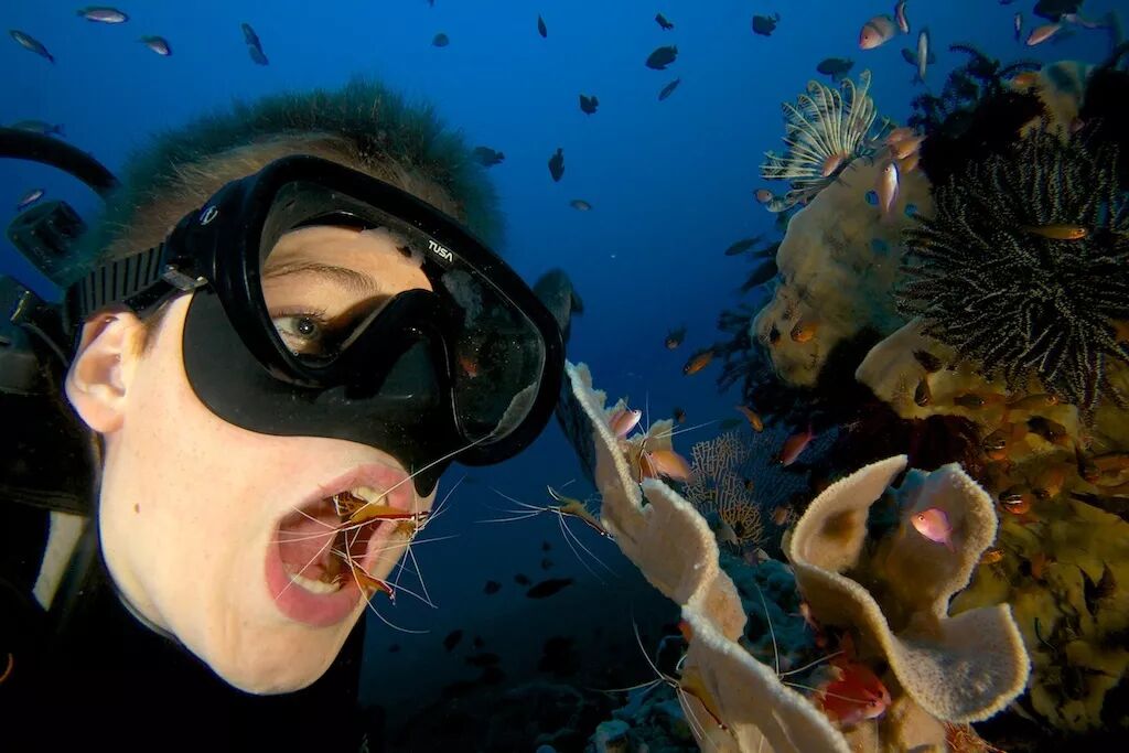 刚入坑潜水那会儿,我就听闻有一种能帮潜水员清洁牙齿的虾。一次偶然的潜水机会,潜导给我们演示了让虾帮忙“剔牙”的操作:深吸一口气,将调节器的二级头从嘴里拿出来,露出牙齿,吐着不会惊扰小虾的小气泡,然后缓慢地靠近小虾;在确认无危险后,小虾就会爬到嘴唇上,开始给清洁牙齿。据说牙齿会有一种酥痒的感觉。