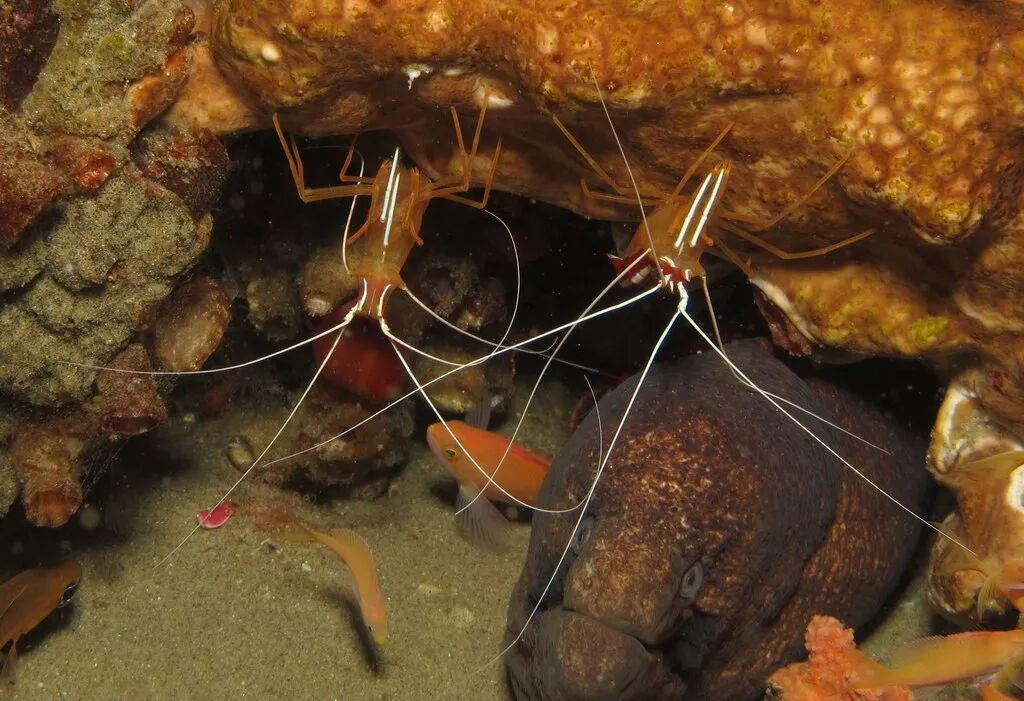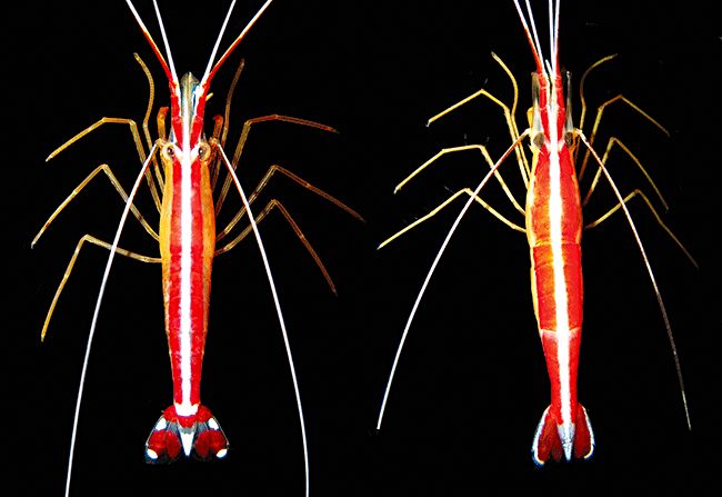 它们能与“客户”形成互惠互利的合作关系。清洁虾帮助鱼类清除身体和口腔里的寄生虫、死皮以及塞在牙缝中的食物碎屑,鱼类则为它们提供食物,并在一定程度上驱赶捕食者。安波鞭腕虾是清洁虾中最具代表性的一员。