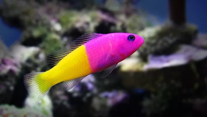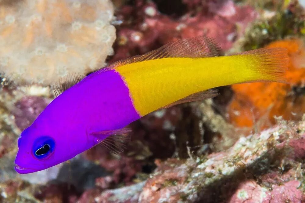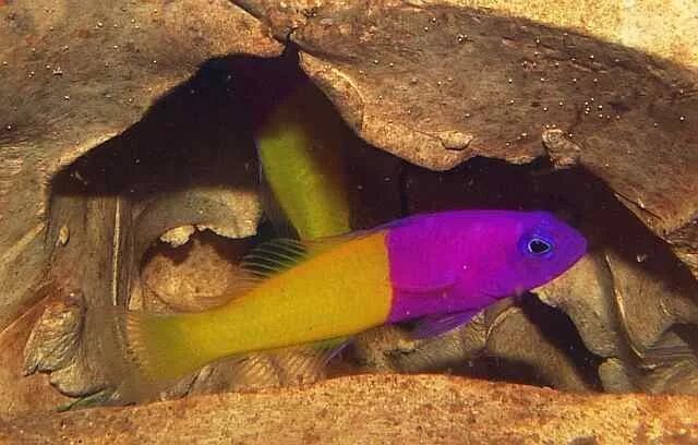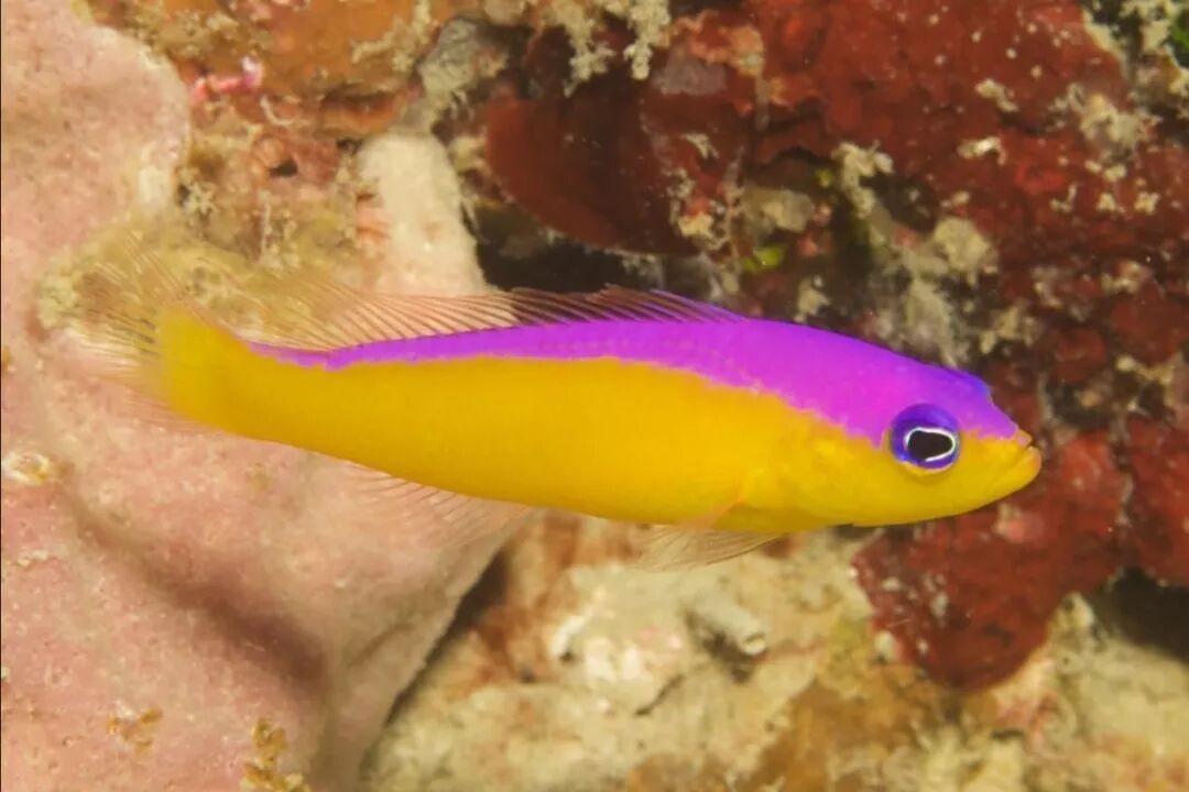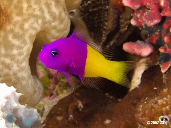 黄紫拟雀鲷的配色确实是皇室的颜色。这种小鱼体色鲜艳明亮,有着典型珊瑚鱼的华丽外观,身体前半部是浓烈的鲜紫色,而后半部则是纯度很高的明黄,象征西方皇室的紫色和东方皇室的黄色同时出现在一条鱼身上。