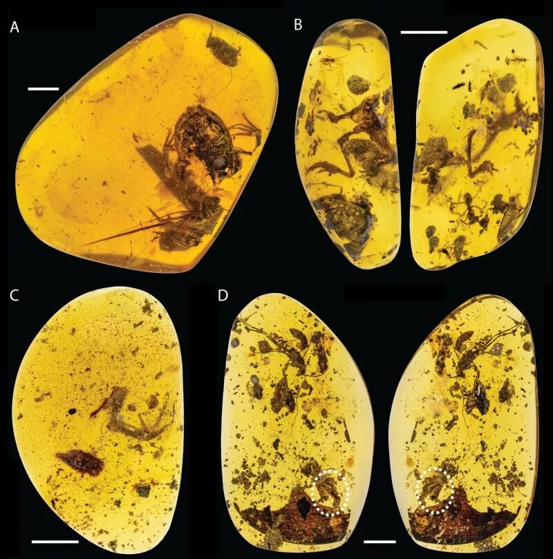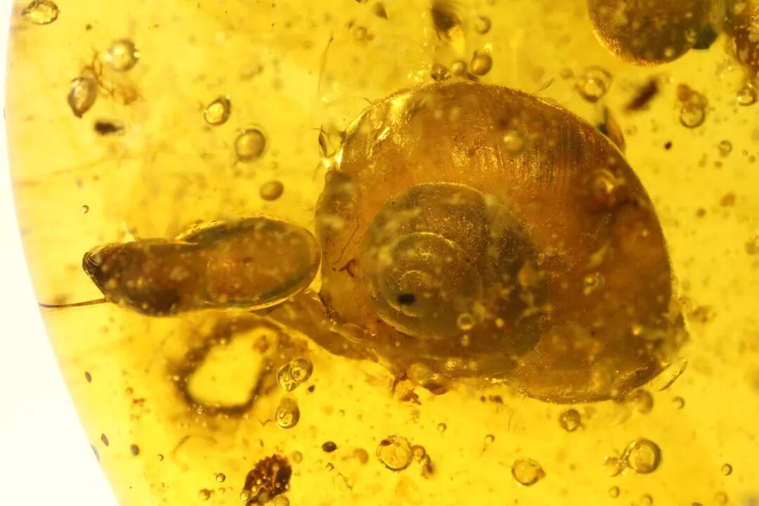 邢老师团队发现的琥珀古鸟类、琥珀蛙和琥珀蜗牛。图片:邢立达