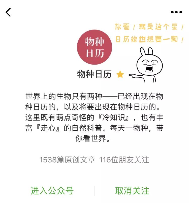 如果你之前已经置顶了“物种日历”,那你就已经点亮小星星(标了星标)啦,日历娘有回礼哟,<戳这里>领取。