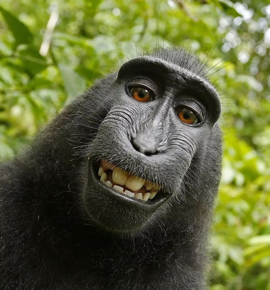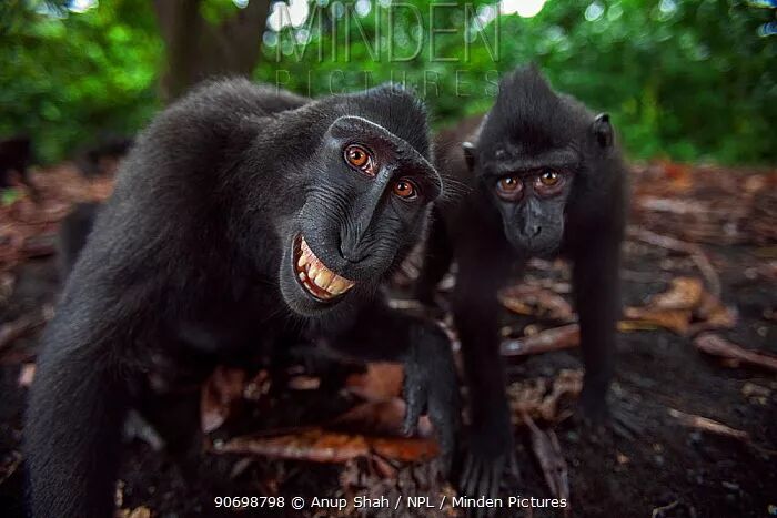 2011年7月9日,维基共享(Wikimedia Commons)的编辑将《每日电讯报》上黑冠猕猴的“自拍”上传到了网站。维基共享由维基媒体基金会(Wikimedia Foundation)创立,专门存放共享版权或已经过了版权保护期的多媒体资料。维基共享认为,这些“自拍”由人类以外的动物“拍摄”,人类并不享有其版权,所以符合自己的共享原则。