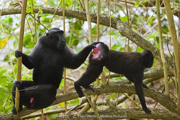 Tangkoko自然保护区,两位母亲正为自己的孩子梳理毛发。图片:Thomas Marent / mindenpictures