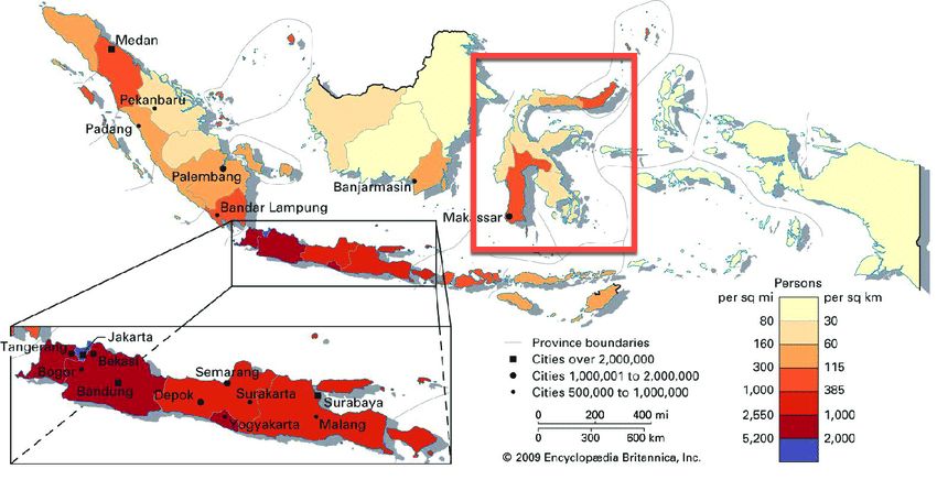 印尼人口分布图,红框为苏拉威西岛,其两块橙红色区域分别就包含了黑冠猕猴与摩尔猕猴的分布区。图片:Encyclopædia Britannica(2009)