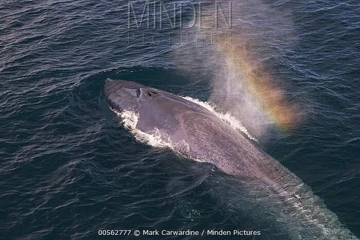 蓝鲸来到浅水换气,喷出的水柱形成一道小小的彩虹。图片:Mark Carwardine / mindenpictures