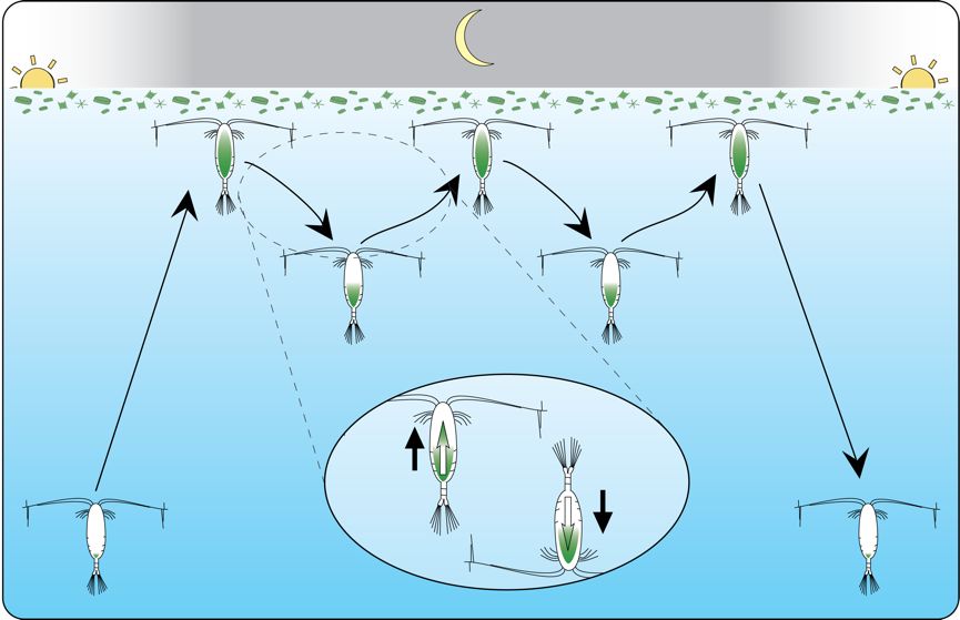 为了填饱肚皮,磷虾自然也要跟着浮游动物上下游动。由浮游动物引起的这一连锁反应,被称为昼夜垂直迁徙。