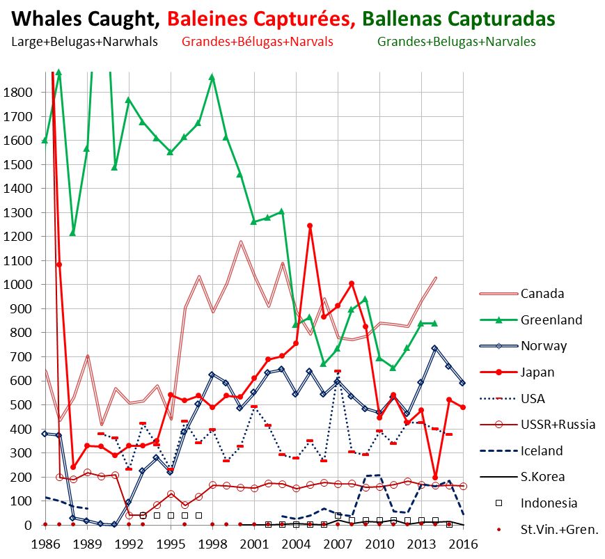 30年间,各捕鲸大国逐年捕鲸数量(白鲸+独角鲸+其他大型鲸)。图片:IWC