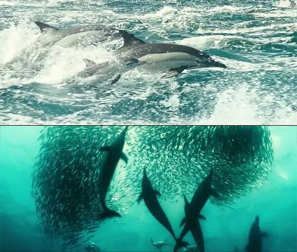 面对似乎取之不尽的沙丁鱼,曾经的天敌和对手结成了同盟。当海豚、鲸鱼、鲨鱼和海鸟们饱餐一顿之后,还会留下大量的沙丁鱼,它们则会继续向前迁徙。就如《海洋》里所说,生命还会继续。
