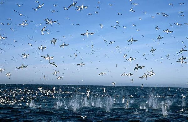 成千上万的南非鲣鸟(Morus capensis)追逐沙丁鱼群迁徙的路线,从空中它们可以很清楚地看到鱼群形成的一条条黑带。在海面十多米处盘旋之后,就是俯冲表演的时间。滑翔、收翅,以每小时40到120公里的时速俯冲入海,在水下形成一条条白色的气泡柱。