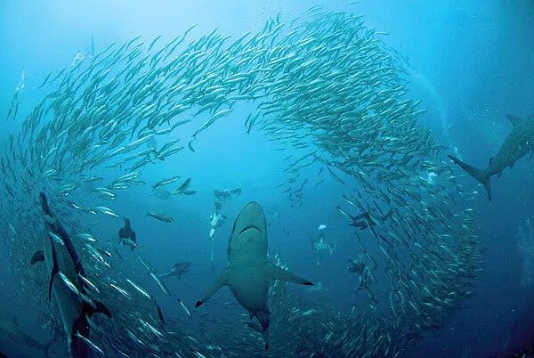 鲨鱼们也和海豚一样,成群在饵球中捕食。图片:《海洋》
