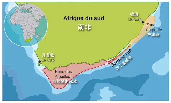 厄加勒斯角(Cape Agulhas)是非洲大陆的最南端,被国际海道测量组织定义为印度洋和大西洋的分界点。每年5月到7月间,数十亿南非拟沙丁鱼就从厄加勒斯浅滩出发,沿着南非东岸向北迁徙,目的地是德班北部的海域,路线长度超过1000公里。