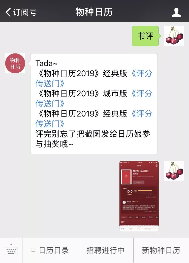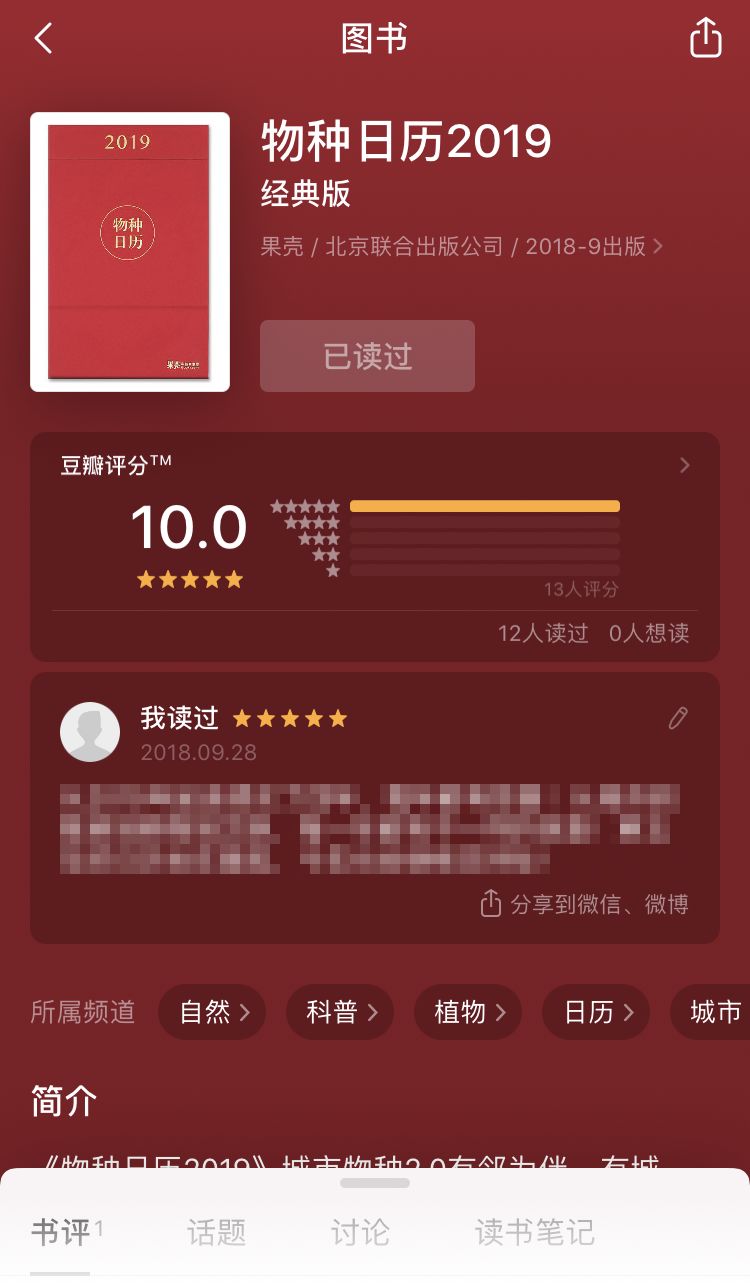 Tips:当然,你可以直接①在豆瓣中搜索《物种日历》,②选择《物种日历2019》进行打分截图,别忘了到物种日历后台③回复关键词 #书评# 后④上传书评截图参与抽奖哦~
