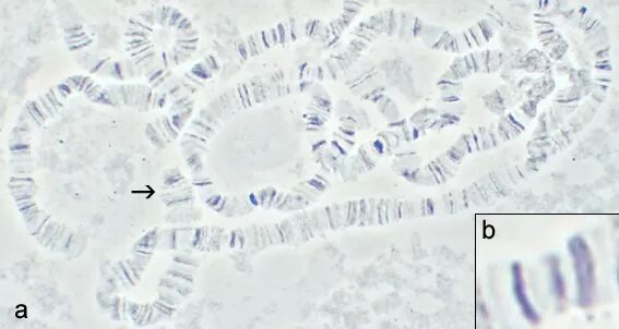 果蝇的多线染色体,b为放大后的横纹细节。图片:J. Albert Vallunen / wikimedia