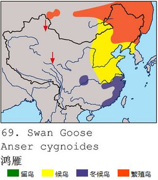 鸿雁的大致分布。橙色部分为繁殖地,蓝色部分为越冬地。图片:马敬能 / 中国鸟类野外手册