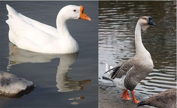 中国家鹅(左)和非洲鹅(右)都是由鸿雁驯化而来。图片:renwen.com,Elf / wikipedia