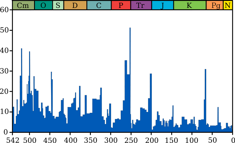 地球上发生过很多次灭绝事件,而二叠纪(P)与三叠纪(Tr)之间发生的那次,是灭绝比例最高的一次。图片:Rursus / wiki commons