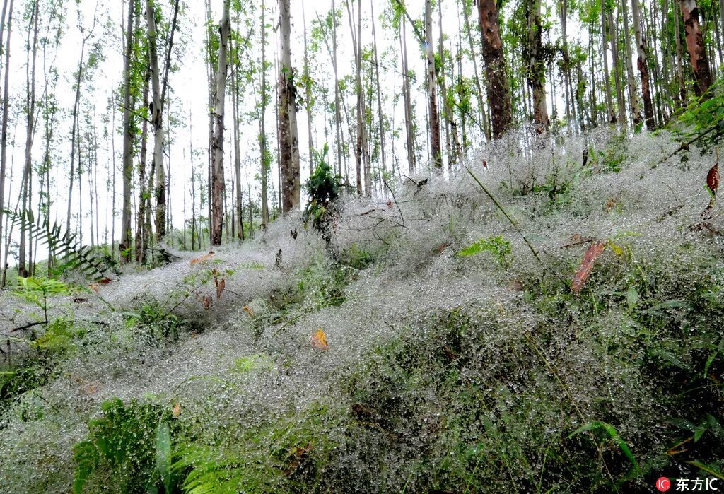 广西上思县南屏瑶族乡,速生桉树林下成片生长着一种绒毛多、枝叶很细的小草,在烟雨天气中,小草上就会附着密密麻麻的露珠,连成了“露珠海洋”。图片:梁富盈 / 东方IC