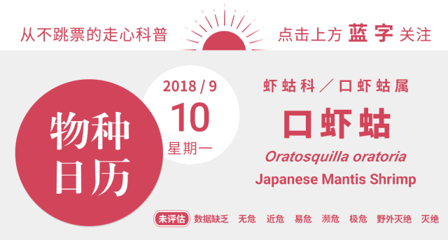 除了以上几个耳熟能详的俗名,口虾蛄还有螳螂虾、琵琶虾、虾弹子等诸多叫法,其中螳螂虾一词是从其英文名mantis shrimp直译过来的。口虾蛄是虾蛄科口虾蛄属(Oratosquilla)的模式种,种本名oratoria源于拉丁文oris,意为口,而属名则是由orato(口)和squilla(虾)构成。