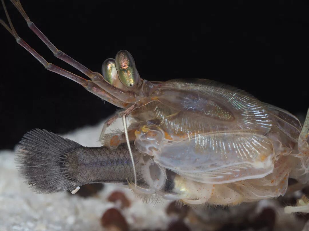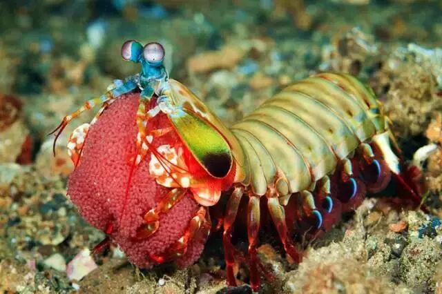 护卵的雌性雀尾螳螂虾,口虾蛄也会有抱卵的行为。<戳这里了解“捶你胸口”的雀尾螳螂虾> 图片:Sonja Ooms / hiveminer.com