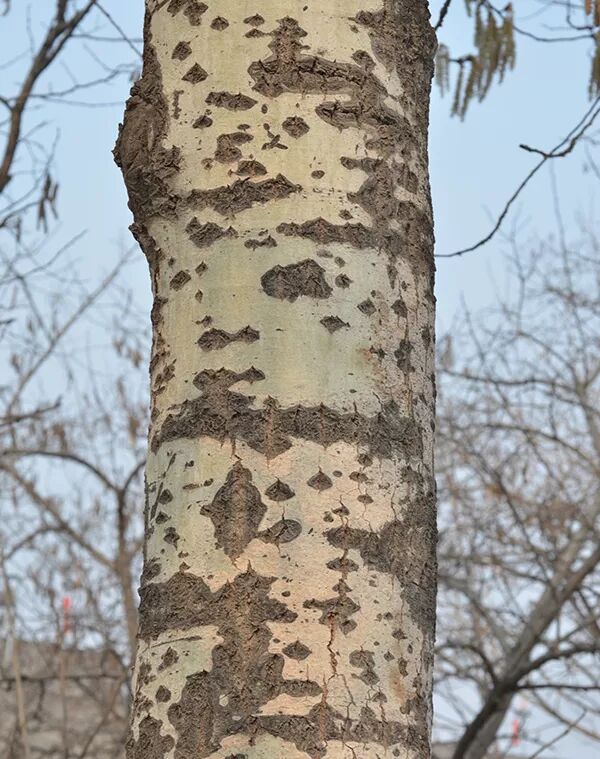 灰绿色的树皮,说明这株在城市绿化中栽植的毛白杨年龄还不算太老。图片:不认识植物
