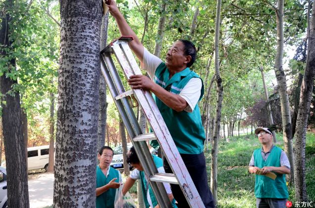 园林工人正在毛白杨上“释放”寄生有白蛾周氏啮小蜂的柞蚕蛹,孵化的小蜂用以对付蛾类林业害虫。<戳这里可以复习柞蚕> 图片:东方IC