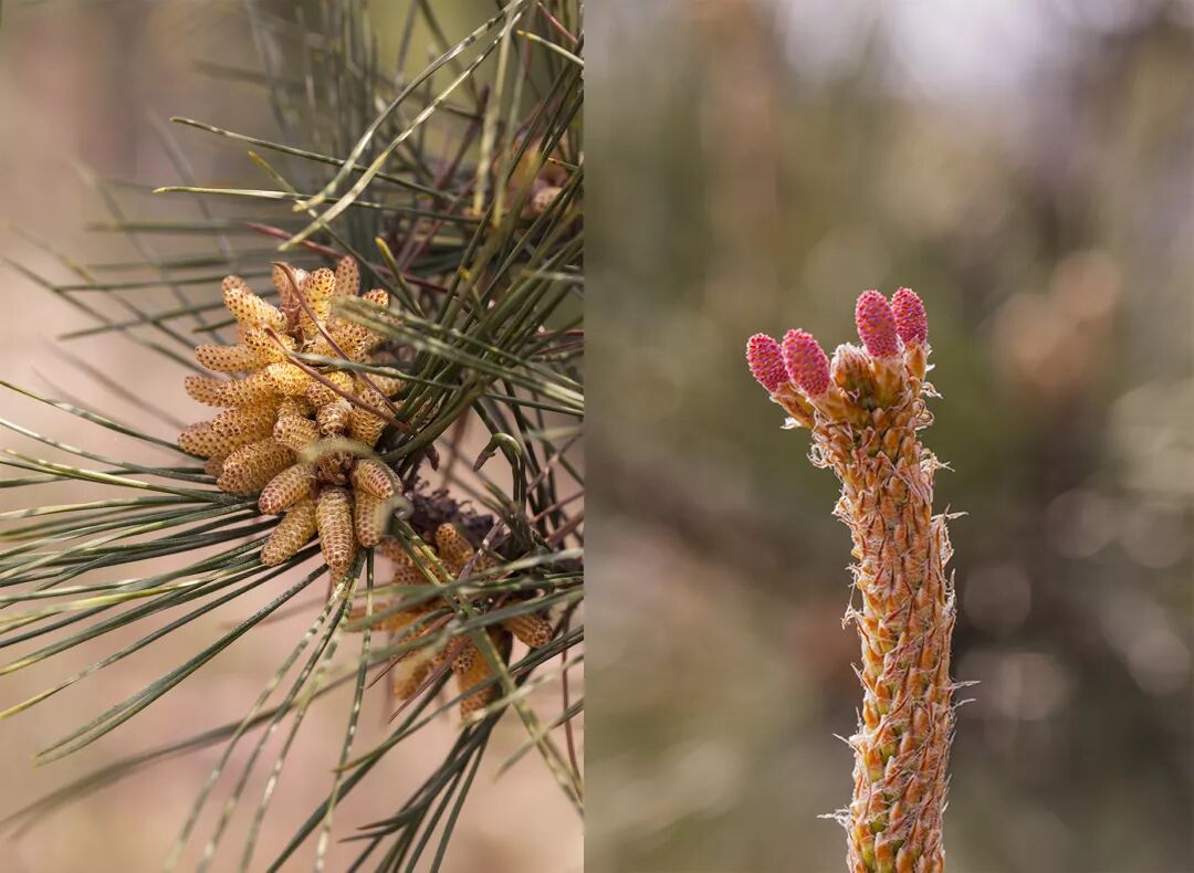 左为马尾松的雄球花,右为雌球花。图片:霜天蛾