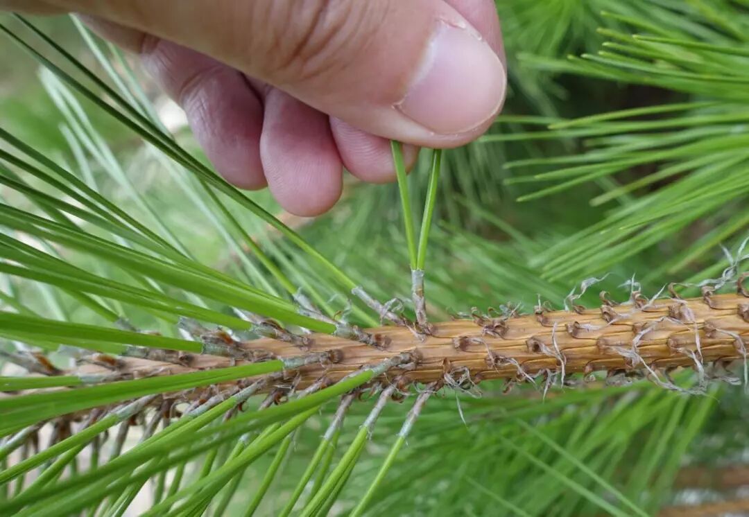 马尾松的针叶,2针一束,基部包有叶鞘。图片:霜天蛾