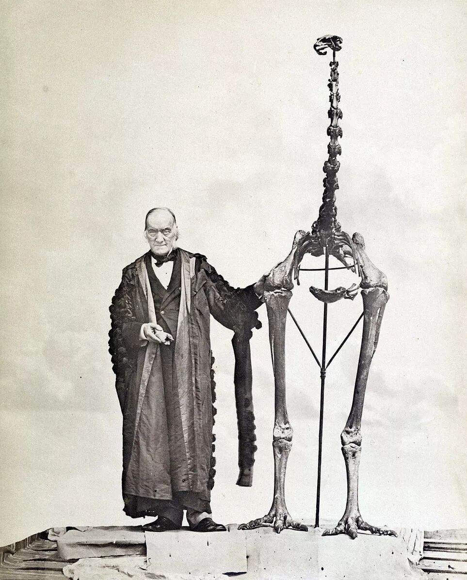 欧文与一恐鸟骨架。欧文在学界的主要贡献,是促成了大英博物馆自然史分馆的建立,然而他为人心胸狭隘,曾不遗余力排除异己,加上晚年其他破坏他人研究的恶行,故遭到英国皇家学会的除名。图片:John van Voorst / wikimedia