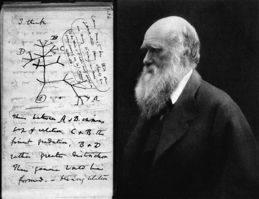 达尔文与他画下的第一个进化树。图片:Charles Darwin & Julia Margaret Cameron / wikimedia