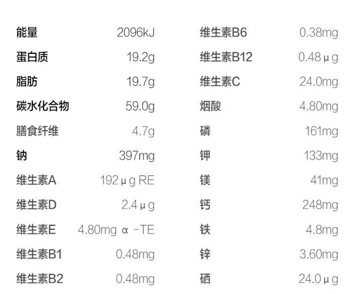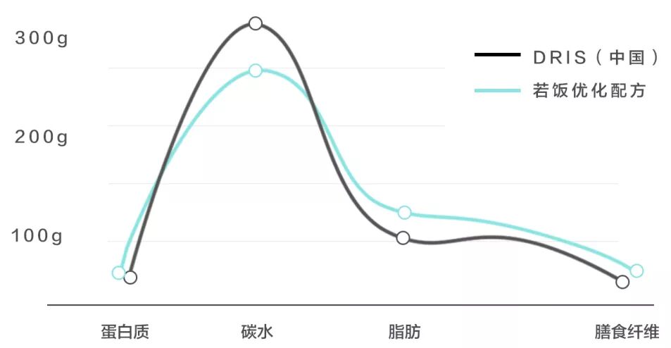 若饭的成分配比,是基于中美两国的成年人每日膳食营养素摄入推荐量(DRIs)设计的。