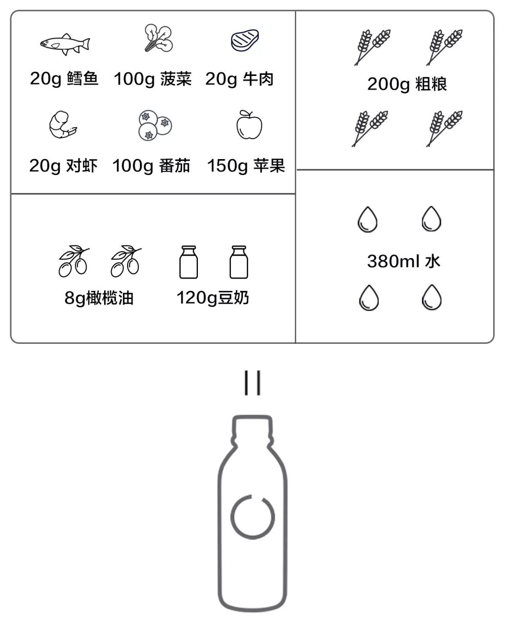 一瓶若饭热量为500大卡,其中各种营养物质等效于多种食物,平时一餐很难实现如此多样化。