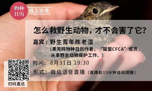 虽然日历娘会告诉大家一些简单的救助方法,但在实际情况中,哪些动物该救,应该怎么救都是不一样的。为了解决大家的疑问,日历娘特意邀请了物种日历作者@野生青年陈老湿为大家开一场有关野生动物救助的线上沙龙。