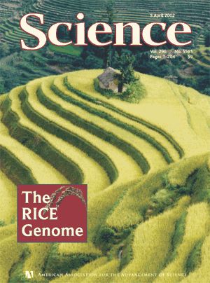 《科学》杂志2002年第4期的封面是种满水稻的梯田,这一期的文章介绍了籼稻和粳稻的基因组。图片:science.sciencemag.org