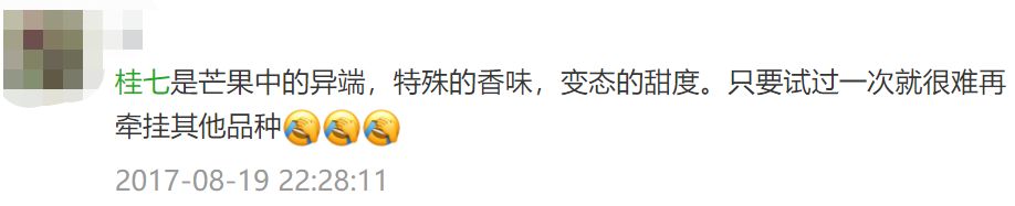 吃桂七也是一件特别爽的事。它个头不大不小刚刚好,汁水充足,肉质丰腴,咬一大口,肥厚的果肉就整个掉进嘴里,鲜甜的汁水不小心顺着嘴角和手指流下来,但你根本顾不上,因为咀嚼柔软光滑的芒果肉才是正事,每一下咀嚼都能感受牙齿切开软滑果肉的愉悦,馥郁香甜的果汁在嘴里横冲直撞,强烈到近乎粗暴的独特香气,瞬间让你缴械投降,迷醉其中。很多人都说:“没有吃过桂七,别说你吃过芒果。”