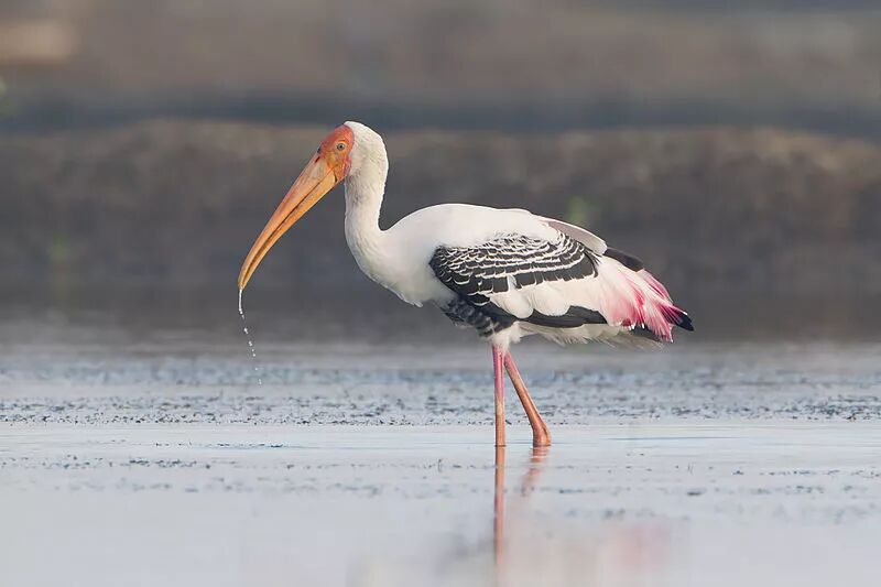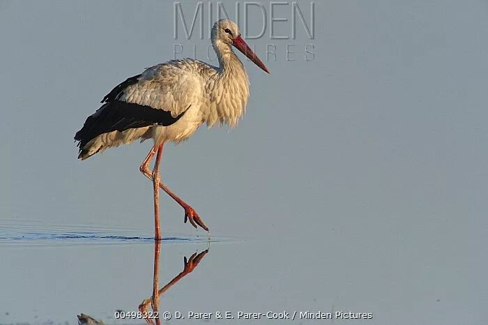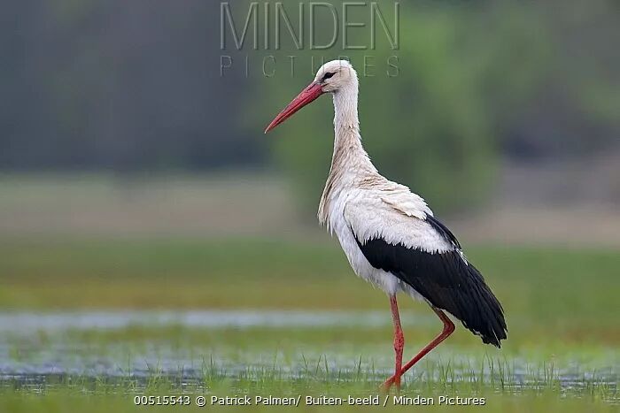 浅的水塘边,有一只白色的大鸟站在水里。高高的个子,长长的尖嘴和细腿也都是红色的。