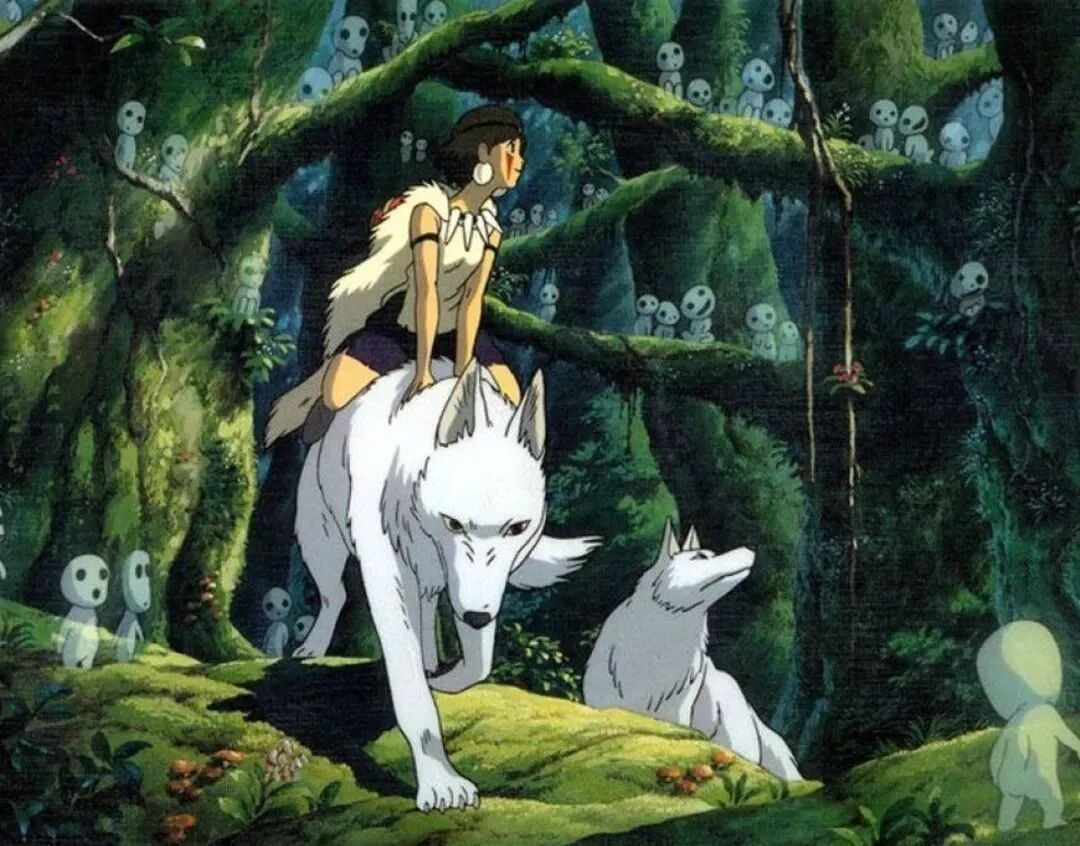 或者,看看宫崎骏电影《幽灵公主》中那片全绿色的森林和幽静的溪谷。