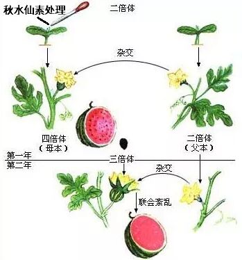 经过秋水仙素处理后可以得到四倍体西瓜,四倍体西瓜与正常的二倍体西瓜杂交后得到三倍体后代。三倍体西瓜成熟后开花结果时,因联会紊乱无法正常产生生殖细胞,所以结出的瓜中无籽或籽粒无法成熟,无法成熟的种子就长成我们经常见到的小小白白软软的未成熟瓜籽。
