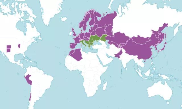目前菘蓝在全世界的分布地区,绿色为原产地区,紫色为引入或归化地区。图片:Plants of the World Online / Kew Science