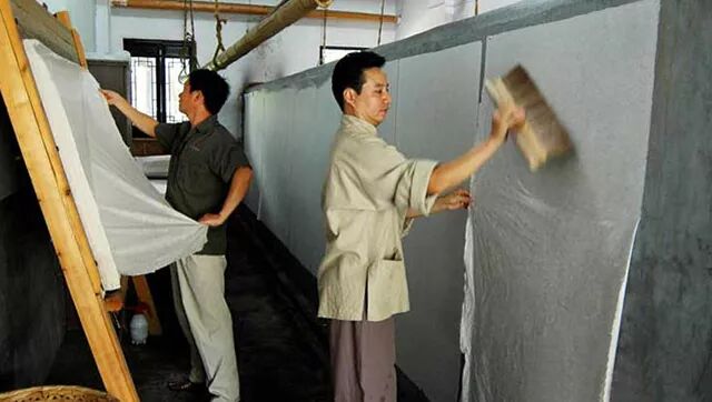 纸药不光是在抄纸时候加到纸浆里,还有一种叫捶纸法的技术,就是把胶质配成溶液浸润纸张,然后用木槌反复敲打,制成更加光滑平整的纸。唐宋时期还出现了胶矾技术,就是利用明矾中的铝离子加强胶质和纸纤维的结合力,至今还用于宣纸加工。未经胶矾处理的宣纸叫做生宣,洇墨性能好,而上过胶矾的叫熟宣,不太洇墨,画工笔画用。