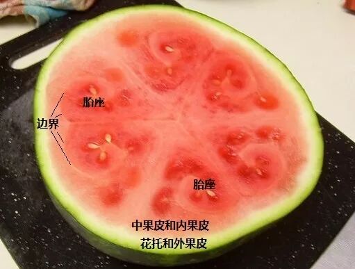 但是故事可不是到这里就结束了。在开花时期,子房内壁上的胚珠着生在胎座上汲取营养,其实所有的果子们都有胎座这个家伙,不过只有到了瓠果里,胎座这个不起眼的配角才得到了展示自己的机会——西瓜就是胎座发育的一个极致。