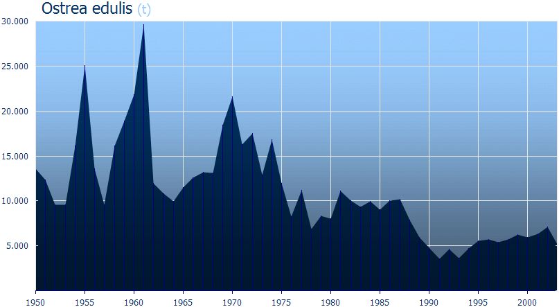20世纪下半叶,全世界欧洲平牡蛎产量变化趋势。图片:Peter Gugerell / wikimedia