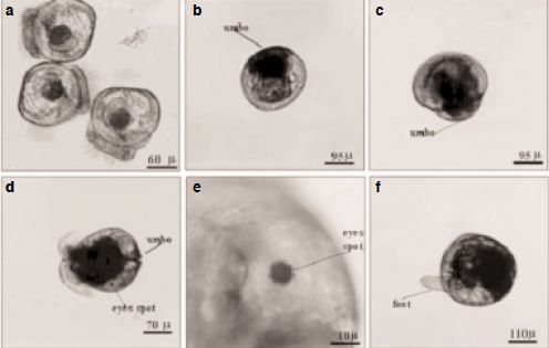 欧洲平牡蛎幼体:a为面盘幼体,b, c箭头所示为发育中的壳顶,d, e可见其眼点,而f为具足面盘幼体。图片:Sefa Acarli et al. / The Israeli journal of aquaculture Bamidgeh(2009)